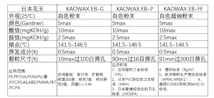 日本花王KAOWAX EB是一類蠟狀的酰胺,其具有高的熔點,并在熔融狀態時保持低粘度。在高溫熔融態時,樹脂和溶劑有良好的相容性。
