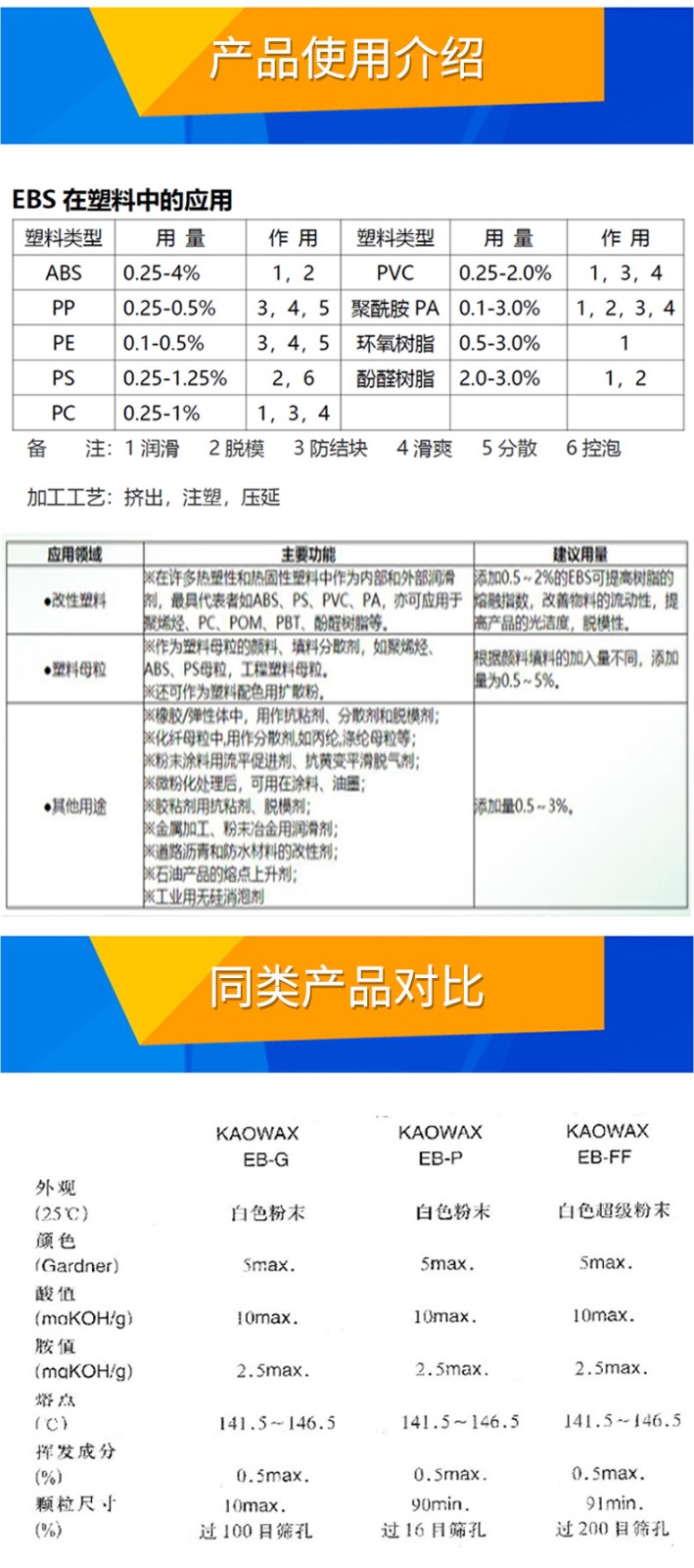 日本花王KAOWAX EB(-FF)是一類蠟狀的酰胺,其具有高的熔點,并在熔融狀態(tài)時保持低粘度。在高溫熔融態(tài)時,樹脂和溶劑有良好的相容性。KAOWAX EB是一種潤滑劑和脫模劑,主要用于熱塑性塑料:如ABS樹脂,PS,PVC等等。